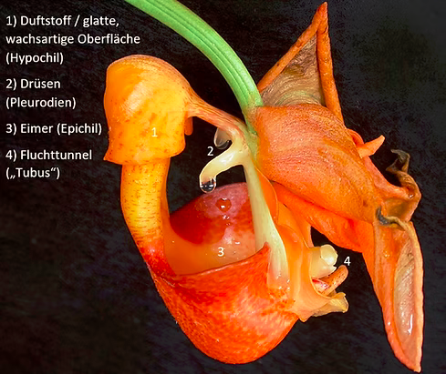 Der obere Teil der Blütenlippe gibt einen Duftstoff ab, der männliche Prachtbienen anlockt. Diese landen oben auf der Blütenlippe und sammeln begierig das Duftsekret, welches auf der Unterseite des helmähnlichen Gebildes abgesondert wird und das sie zum Beeindrucken weiblicher Bienen für die Paarung benötigen. Die Oberfläche dieses Bereiches ist außerdem wachsartig und sehr glatt. Die Biene hat dort keinen Halt und fällt beim Klettern in den darunter liegenden Eimer.